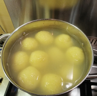 Vervolgens werden er met vochtige handen knoedels gemaakt, met als vulling 5-6 broodblokjes. De knoedels werden in een ruime pan kokend water gelegd, waarna de hitte direct werd gereduceerd. Na een paar minuten kwamen de knoedels bovendrijven. Tot slot blijven de knoedels nog 30 minuten in het warme, niet kokende water