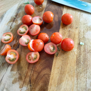Voeg de plakjes komkommer en de partjes tomaat aan de saus toe, even omscheppen en klaar.
