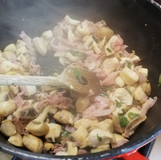 Snijd de kipfilet in stukjes, strooi er wat zout over en bak het bruin in een braadpan, niet te lang want de kip moet niet te droog worden, voeg dan de champignons toe en bak ze kort mee. Doe vervolgens de bosui en de ham bij de kip/champignons en bak het even snel mee. Haal alles daarna uit de pan en schep het voor even op een bord.