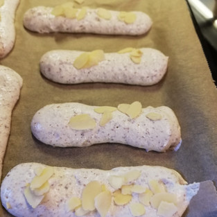 Bestrooi tot slot de strepen met geschaafde amandelen en bak de bokkenpoten ongeveer 15 minuten in de oven. Laat ze na de verstreken baktijd afkoelen op de plaat.